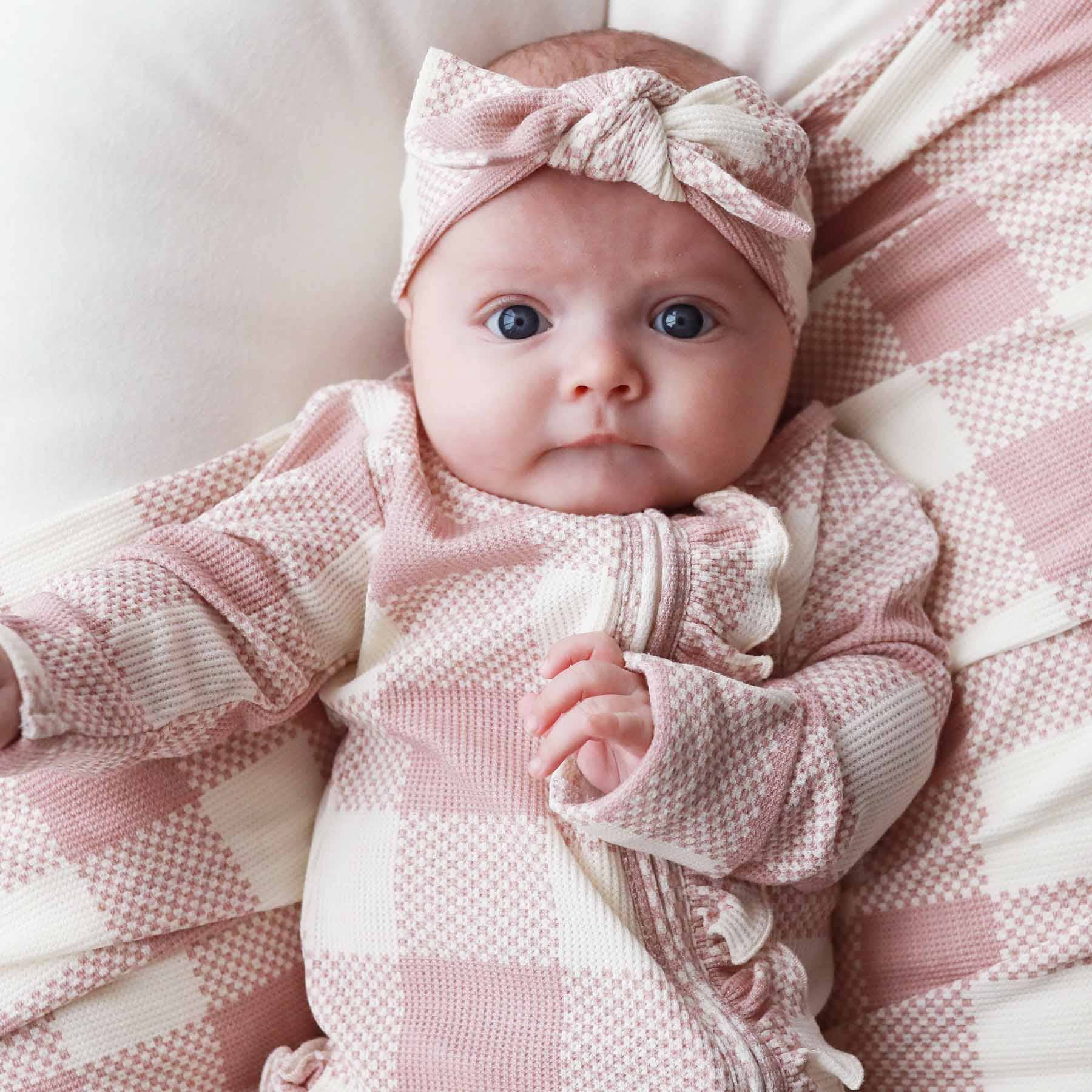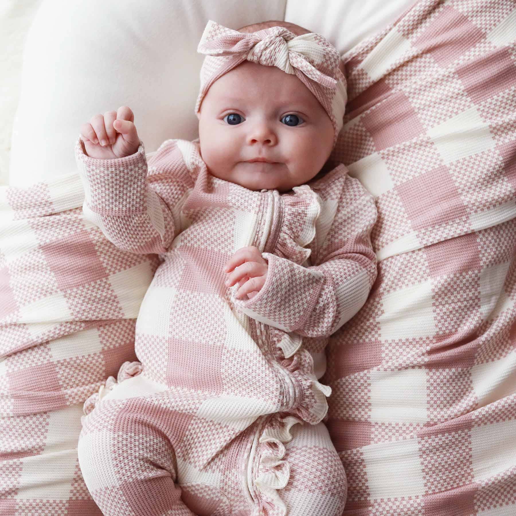 Big Check Bamboo Waffle Zipper Ruffle Footie | Rosy: Newborn