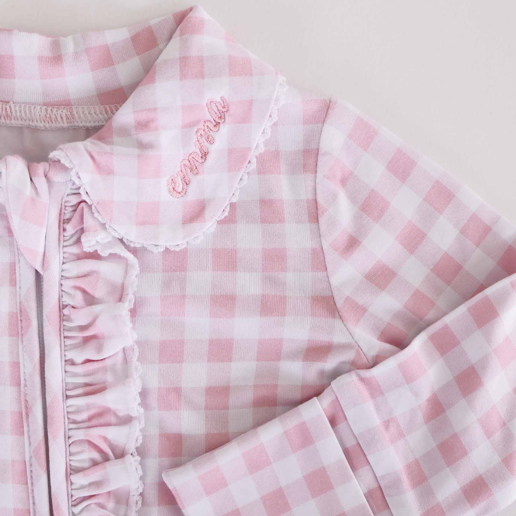 Peter Pan Collar Ruffle Zipper Footie: Rosy Gingham / Non-Personalized / 0-3 months