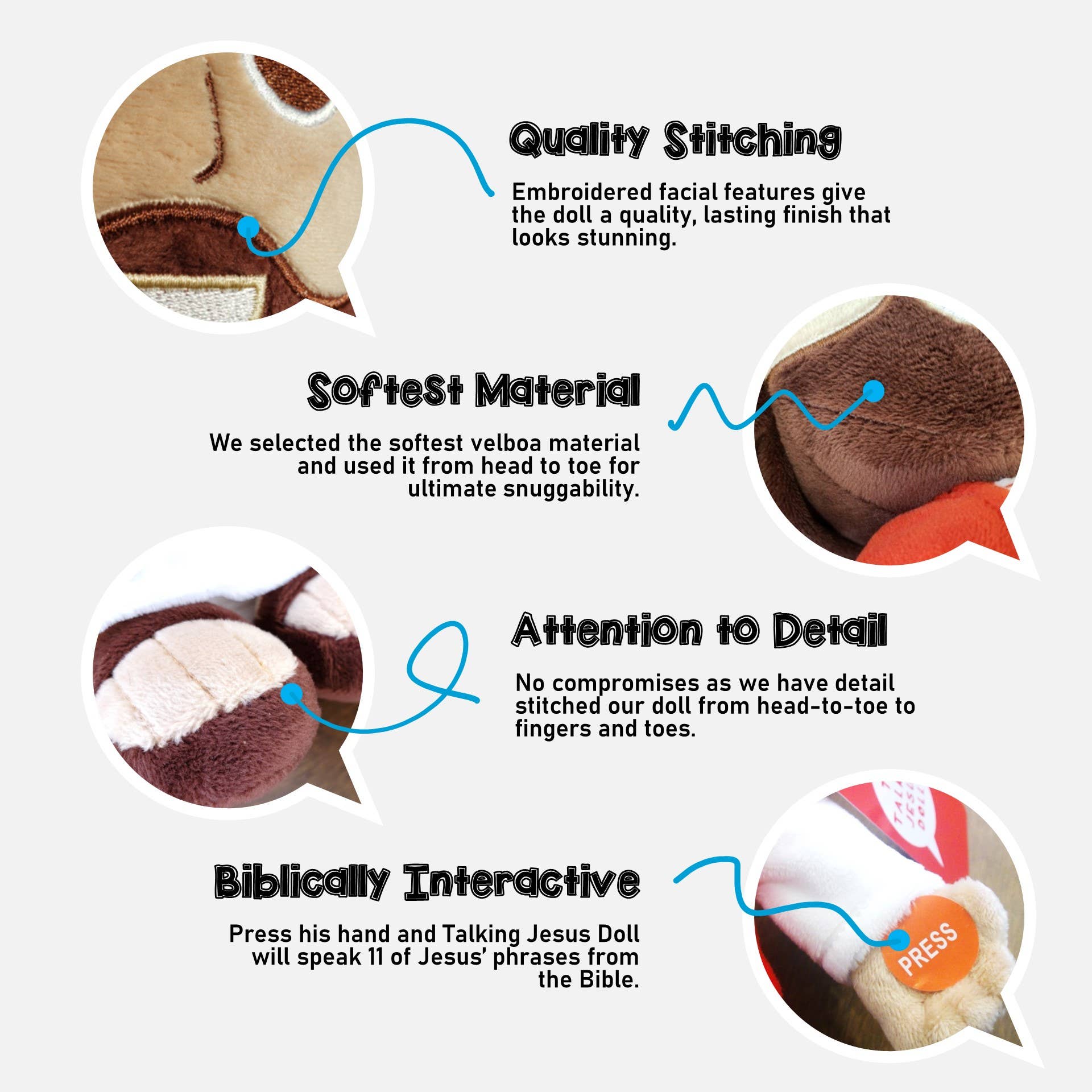 The Talking Jesus Doll is a beautiful 12" plush Jesus that speaks 10 phrases that Jesus said in the Bible. Jesus welcomes children with his outstretched arms, warm smile and a super-soft body. Children LOVE to squeeze his hand to make him talk. Parents and grandparents LOVE that their little ones are learning Jesus' important teachings from the Bible. Perfect for Christmas or for Christian Easter baskets. More than a toy, it opens up kids to Christ. Teach your kids before the World does.